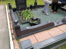 На нижеприведённых фотографиях представлен окончательный вид места захоронения. Мы поставили на место памятник, сделали цветник, уложили внутрь участка гранитную брусчатку. По периметру места захоронения проходит старый цоколь, на этот раз укреплённый на надёжное и добротное основание. В правую половину участка высадили две туи (одну в специальную клумбу, другую в пластиковую кадку), в цветник поместили барвинок. В таком виде объект был представлен клиенту, который остался очень доволен проделанной работой.